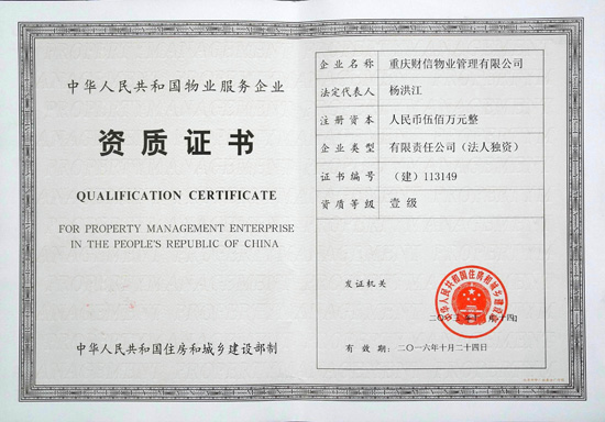 10月24日,經(jīng)中華人民共和國(guó)住房和城鄉(xiāng)建設(shè)部審批通過(guò),財(cái)信物業(yè)管理有限公司正式獲取物業(yè)服務(wù)企業(yè)一級(jí)資質(zhì)證書。