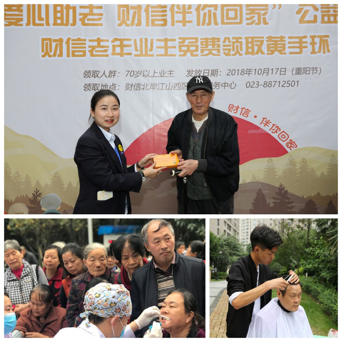 愛滿重陽,情暖人心。今年重陽節(jié),由集團發(fā)起的“愛心助老——財信伴你回家”公益活動在巴南區(qū)安瀾鎮(zhèn)頂山村、北部新區(qū)福利院、北岸江山和財信國際社區(qū)舉行。集團為四地70歲以上老人送上了慰問品和防走失黃手環(huán),給老人們帶去了最真摯的祝福和關(guān)愛。